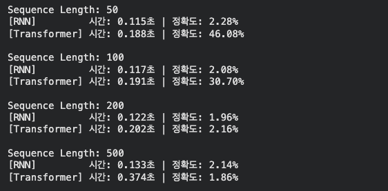 나는 Transformer가 병렬처리이기에 시퀀스 길이에 상관없이 일정한 학습 속도를 유지할 것이라고 예상했지만, 실제로는 시퀀스 길이가 늘어날수록 학습 시간이 증가하는 것을 확인했다.