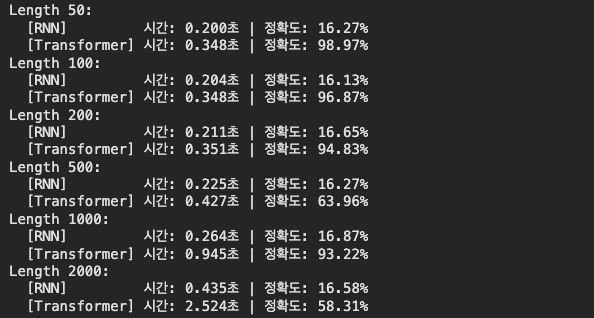 - 가설2: RNN은 시퀀스가 길어질수록 기울기 소실로 인해 앞부분의 정보를 망각하지만, Transformer는 Self-Attention 메커니즘을 통해 시퀀스의 모든 위치에서 정보를 참조할 수 있기 때문에 장기 기억력이 뛰어날 것이다.