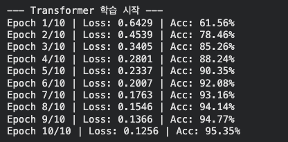 self.pos_embedding: 위치 임베딩 레이어를 정의한다. Transformer는 시퀀스의 순서를 인식하기 위해 위치 정보를 필요로 하므로, 각 위치에 대한 임베딩을 학습한다.self.transformer: 모든 토큰 사이의 관계를 한번에 계산한다.out[:, -1, :]: Transformer의 출력에서 마지막 타임스텝의 출력을 추출한다. Transformer는 시퀀스의 모든 위치에서 정보를 참조할 수 있기 때문에, 마지막 타임스텝의 출력은 전체 시퀀스의 정보를 요약한 벡터가 된다.